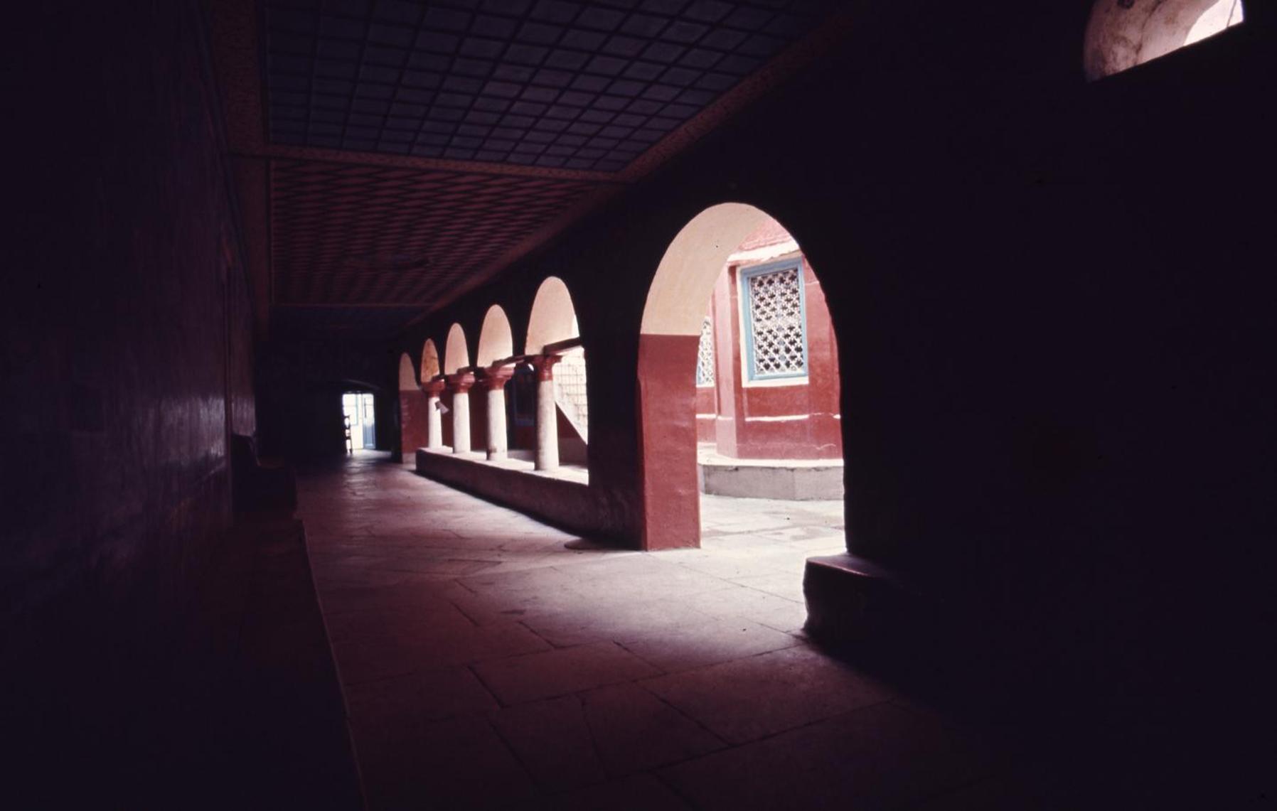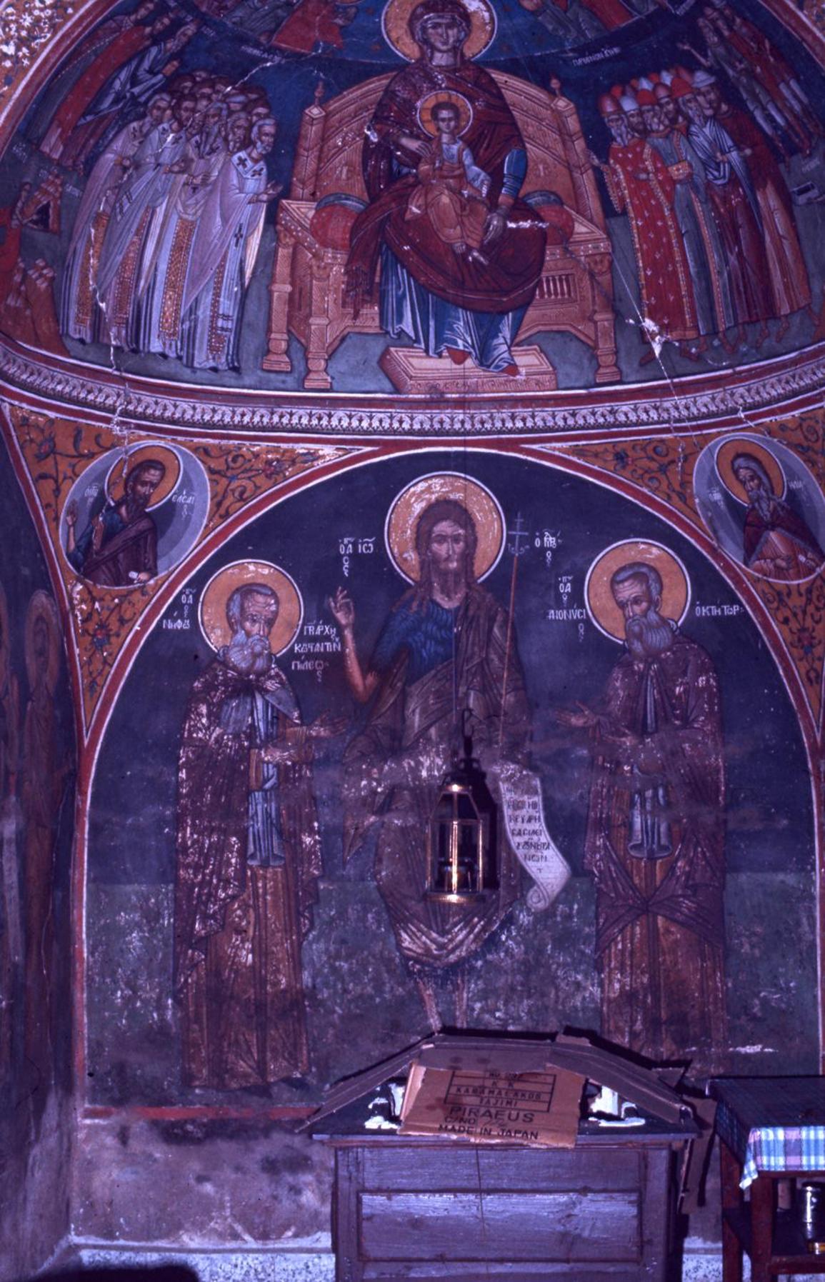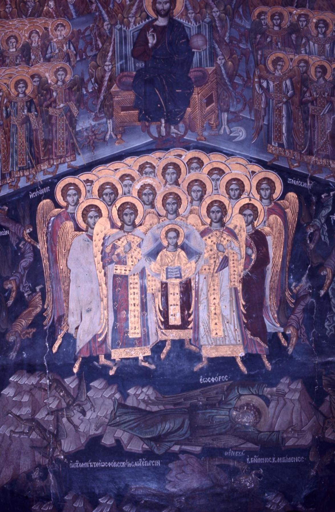 The wall opposite the arcade is covered with frescoes depicting scenes from the book of the Apocalypse