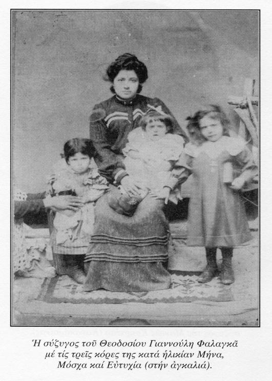 Από αριστερά: η Φαλαγκά Μόσχα του Θεοδόση (14312) #1967 info σύζ. Γιαλούρη Μιχαήλ του Γιαννούλη η μητέρα της Λασκαρώ που κρατά την μικρότερη κόρη της Φαλαγκά Ευτυχία του Θεοδόση (14313) σύζ. Πολέμη Μιχαήλ του Δημητρίου και δεξιά όρθια η Φαλαγκά Ασημίνα του Θεοδόση (14311) #1966 info σύζ. Σαρρή Νικολάου του Αντώνη.