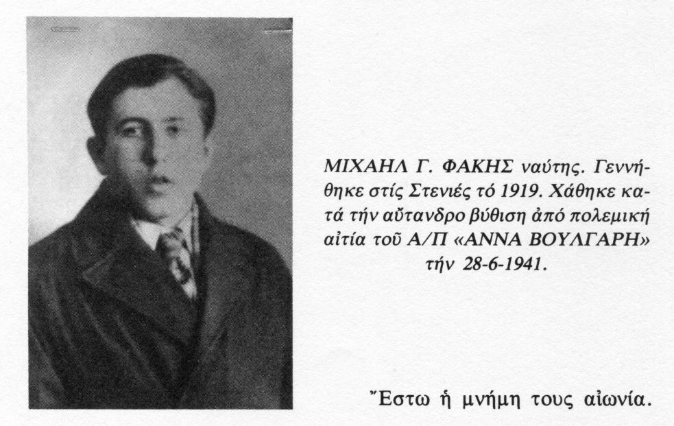 Πατήστε εδώ για να διαβάσετε για το θάνατο του στον Β’Παγκόσμιο Πόλεμο στο πλοίο «ΑΝΝΑ ΒΟΥΛΓΑΡΗ» Πατήστε εδώ για να δείτε το μνημείο πεσόντων Στενιωτών κατά τους δύο παγκοσμίους πολέμους. Πατήστε εδώ για να δείτε την καταγραφή του τορπιλισμού, από Γερμανικά αρχεία. Πατήστε εδώ για να δείτε την καταγραφή του τορπιλισμού, από άλλα Ευρωπαϊκά αρχεία.