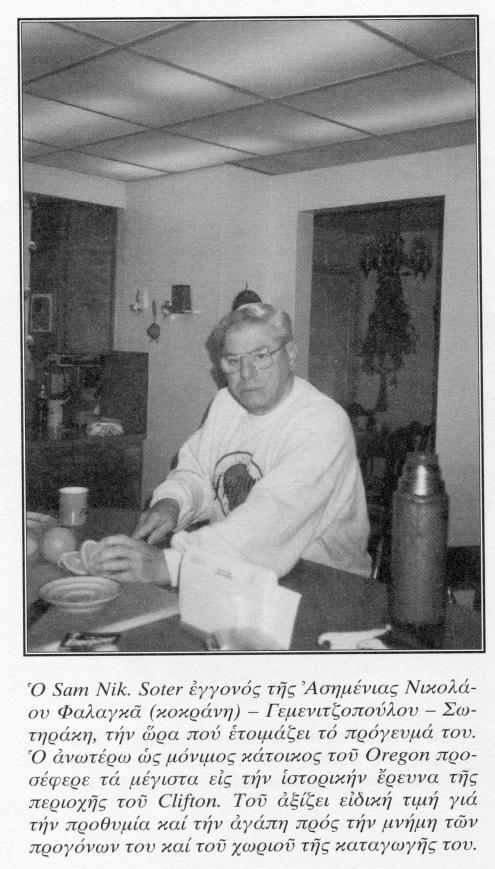 Ορισμένες πληροφορίες αριστερά είναι λανθασμένες. Για την ιστορία, ο Sam ήταν εγγονός της Φαλαγκά Ασημένιας του Νικολάου (1421) #1938 συζ. του Γεμενιτζόπουλου Σωτήρη του Αντωνίου. Από το μικρό όνομα του πατέρα του, ο Sam καθώς και ο μεγαλύτερος αδελφός του Αντώνης υιοθέτησαν το επίθετο Soter όταν εγκαταστάθηκαν στην Αμερική. Το επίθετο Σωτηράκης ήταν το επίθετο του συζύγου της αδελφής τους Ερασμίας. Η Ερασμία καθώς και ο μικρότερος αδελφός τους Σιλβέστρος παρέμειναν στην Ανδρο.