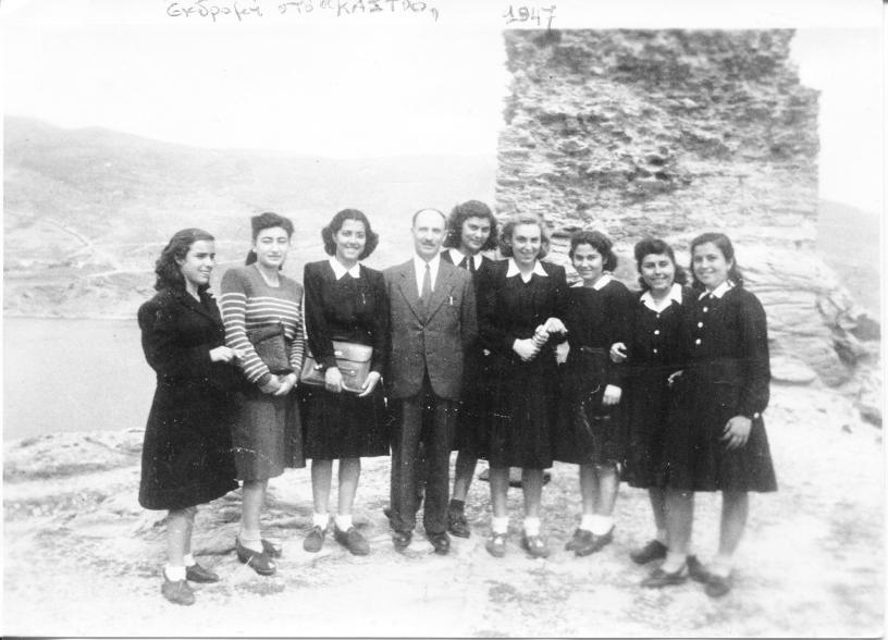 Μαθήτριες του Γυμνασίου της Ανδρου σε περίπατο στο κάστρο της Χώρας. Ημερομηνία 28 Μαρτίου 1947.