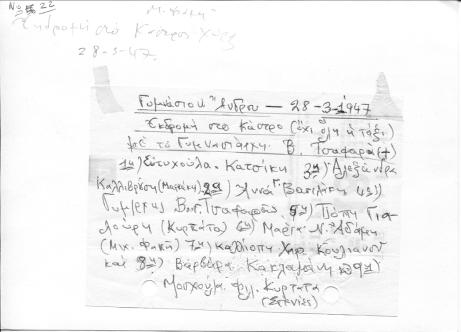 Από αριστερά πρώτη η Κατσίκη Ευτυχούλα του Δημητρίου (1312) #1231 σύζ. Πολέμη Ανδρέα του Ιωάννη. Πέμπτη στο κέντρο, πίσω από τους υπόλοιπους η Γιαλούρη Πηνελόπη του Ιωάννη (122332) #2077 info συζ. Κυρτάτα Μιχαήλ του Νικολάου. Στην άκρη δεξιά η Κυρτάτα Μόσχα του Φιλίππου (112213342) #497 info σύζ. Μπουκουβάλα Νικολού του Δημήτρη.