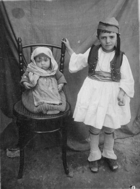 Πάνω, ο Χαρίλαος και η αδελφή του Ειρηνούλα είναι ντυμένοι με εθνικές στολές (φωτογραφία του 1922). |