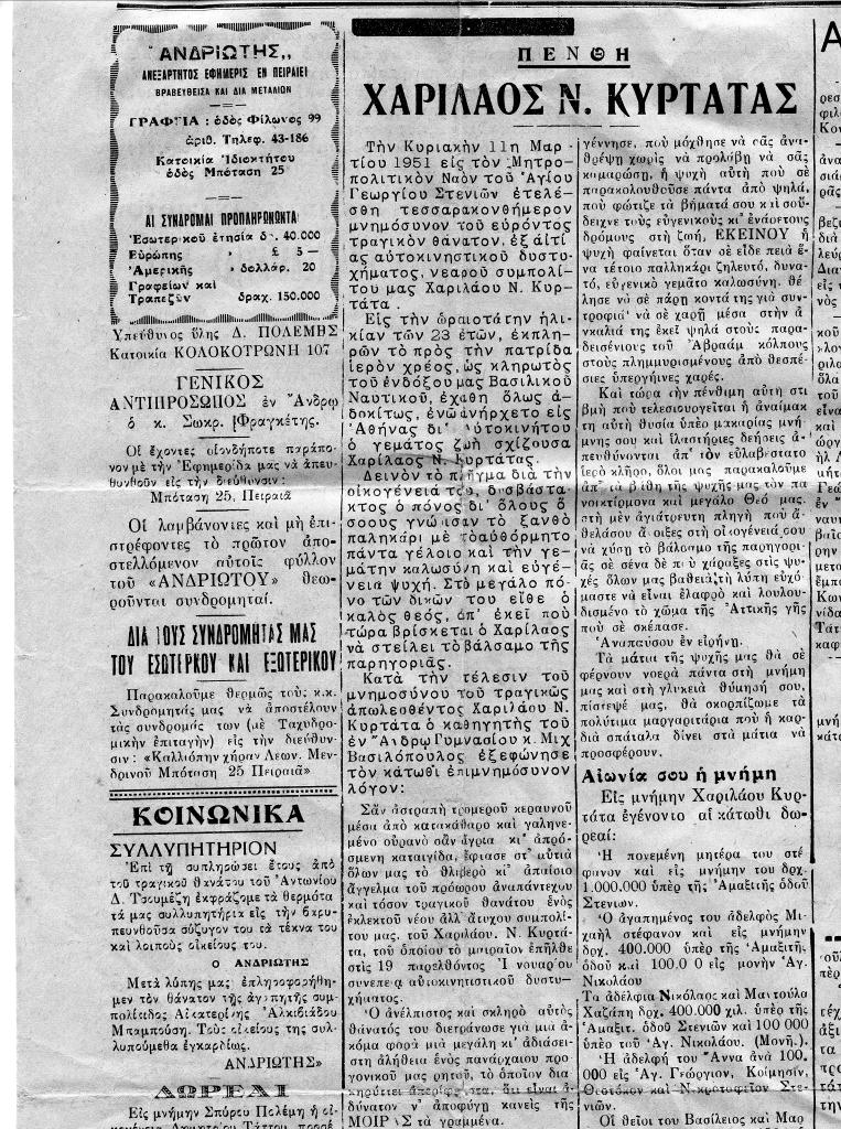 Στις 19 Ιανουαρίου του 1951 συνέβη ένα τραγικό γεγονός που βύθισε σε πένθος το χωριό. Ενα βαρύ όχημα μεταφοράς προσωπικού (αυτά που είναι γνωστά σαν REO) μετέφερε ναύτες και υπαξιωματικούς του Βασιλικού Ναυτικού. Ανάμεσα στα άτομα που μετέφερε το όχημα προς την Αθήνα ήταν και ο Στενιώτης Κυρτάτας Χαρίλαος του Νικολάου, είκοσι τριών ετών τότε. Κάτω από συνθήκες που δεν είναι απόλυτα γνωστές, ο Χαρίλαος έχασε ακαριαία τη ζωή του. Κατ’ άλλους το βαρύ όχημα έγειρε στο πλάι, ο Χαρίλαος πήδηξε έντρομος έξω και το φορτηγό τον κατεπλάκωσε, κατ’ άλλους (εκδοχή που έχω ακούσει και εγώ) τον χτύπησε η βαριά πίσω πόρτα του φορτηγού όταν αυτός έβγαινε από αυτό. Κατά το Στενιώτικο έθιμο όμως, το όνομα του δεν χάθηκε αλλά δόθηκε από την αδελφή του Μαντούλα σύζ. Νικολάου Χαζάπη, στον δεύτερο γιο της. Στο χωριό μας δίνουμε μεγάλη σημασία στα έθιμα, ιδιαίτερα στο θέμα της ονοματοδοσίας των παιδιών, τιμώντας νεκρούς αδελφούς, όλους τους γονείς του ζευγαριού καθώς και άτομα που σε τραγικές συνθήκες υιοθέτησαν ορφανά. Η απόκλιση από το έθιμο αυτό σύμφωνα με τα ήθη μας είναι ανεπίτρεπτη και εξοστρακίζει τους υπαίτιους.