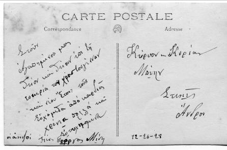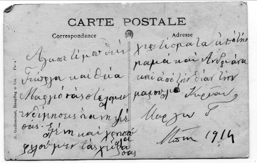 Η φωτογραφία απευθύνεται στον αδελφό της μητέρας της Ανεζιώς, Γιώργη Αντ. Μπέη (Σαρανταπουλιά) και τη σύζυγο του Μαριώ Παλαιοκρασσά.