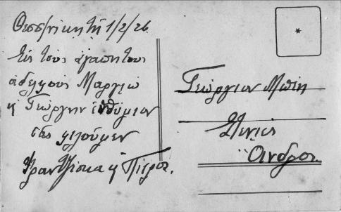 Η φωτογραφία απευθύνεται στον αδελφό της μητέρας της Ανεζιώς, Γιώργη Αντ. Μπέη (Σαρανταπουλιά) και τη σύζυγο του Μαριώ Παλαιοκρασσά.