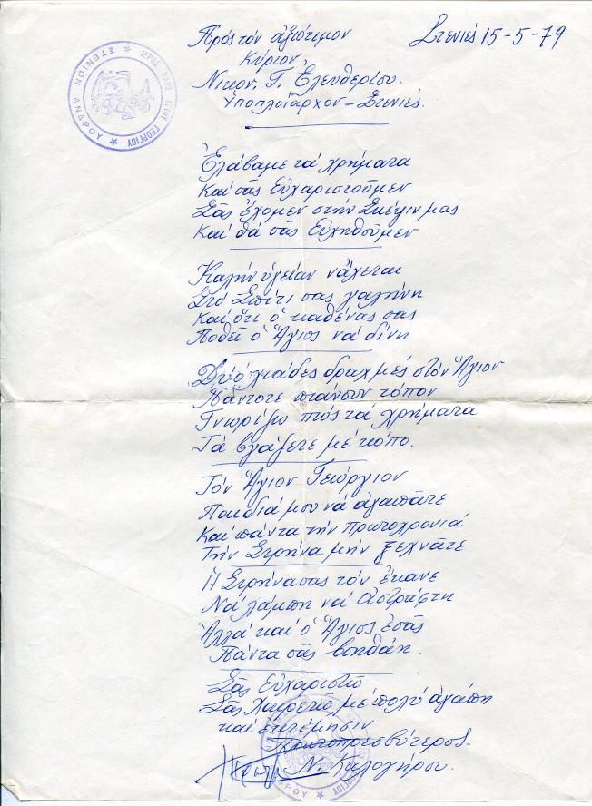 Στενιές 15-5-79 Προς τον αξιότιμον κύριον Νίκον Γ.Ελευθερίου Υποπλοίαρχον - Στενιές. __________________