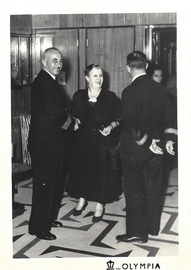 Πάνω, η Μαριόγκα Ραπτάκη του Νικολάου (11421) στο υπερωκεάνιο «ΟΛΥΜΠΙΑ» με αξιωματικούς του πλοίου.