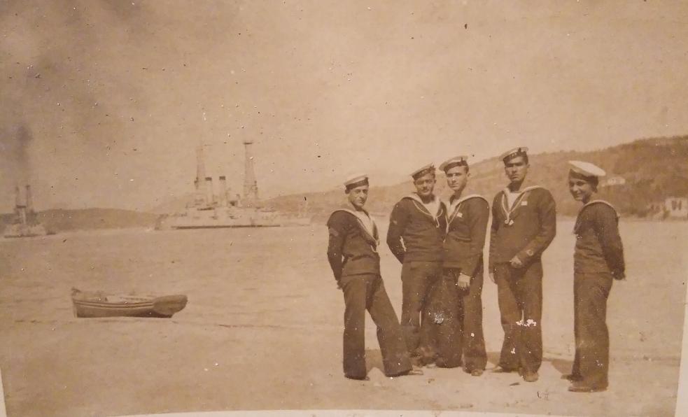 Τιος επόμενες δύο φωτογραφίες που παρουσιάζουν τον Πέτρο νεοσύλλεκτο στο ναύσταθμο του Πόρου το 1928 προσέφερε η κα Μαντούλα Μπέη σύζ. Ανδρέα Παλαιοκρασσά.