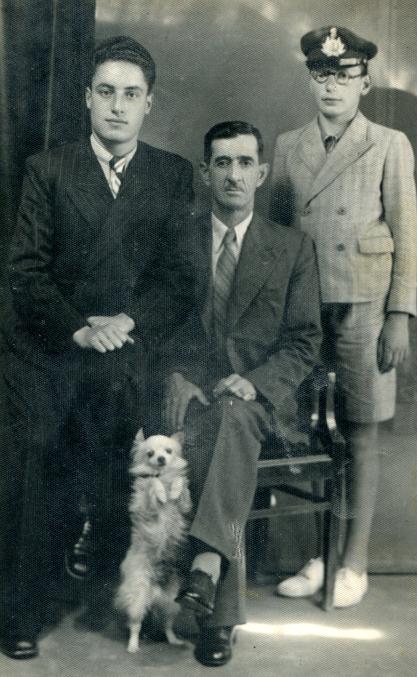 Αριστερά, ο Μιχάλης με γυαλιά και πηλίκιο του Γυμνασίου (δεξιά στη φωτογραφία) με τον μεγαλύτερο αδελφό του Παλαιοκρασσά Γιώργη του Δημητρίου (111122121) #2019 info. και τον πατέρα τους Παλαιοκρασσά Δημήτριο του Γεωργίου (11112212) #2758 info.