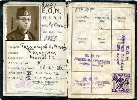 Πάνω, το φυλλάδιο του Μιχάλη, φαλαγγίτη της (υποχρεωτικής κατά τη δικτατορία του Μεταξά) ΕΟΝ. |