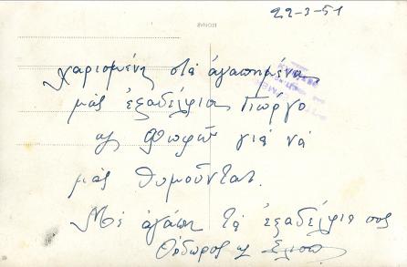 Ο Θόδωρος ήταν ξυλουργός το επάγγελμα. Επάνω, το επισκεπτήριο του. Οι ευχές απευθύνονται στον πρώτο εξάδελφο της Ελισώς, τον Μήτσο Πασχάλη.