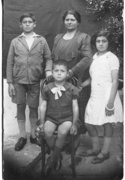 Πάνω, από αριστερά ο Τάκης, η μητέρα του Φρατζεσκούλα (162) #441 info σύζ. Πολέμη Σταμάτη του Δημήτρη, η αδελφή του Αννα και εμπρός καθιστός, ο μικρότερος αδελφός του Γιώργος.