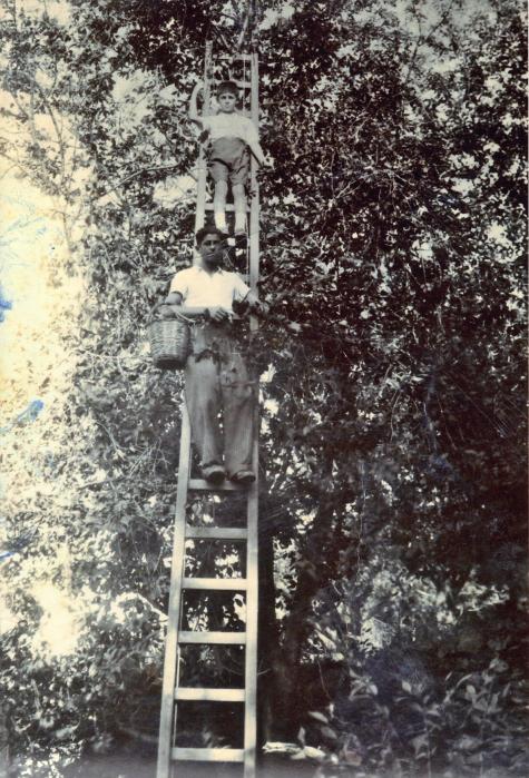 Στη σκάλα, κάτω ο Τάκης και πάνω ο αδελφός του Γιώργης σε μια βυσινοκερασιά.