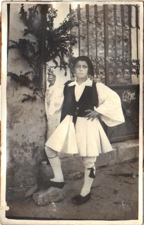 Αριστερά, ο Τάκης με την εθνική στολή, στην πόρτα του Δημοτικού σχολείου.