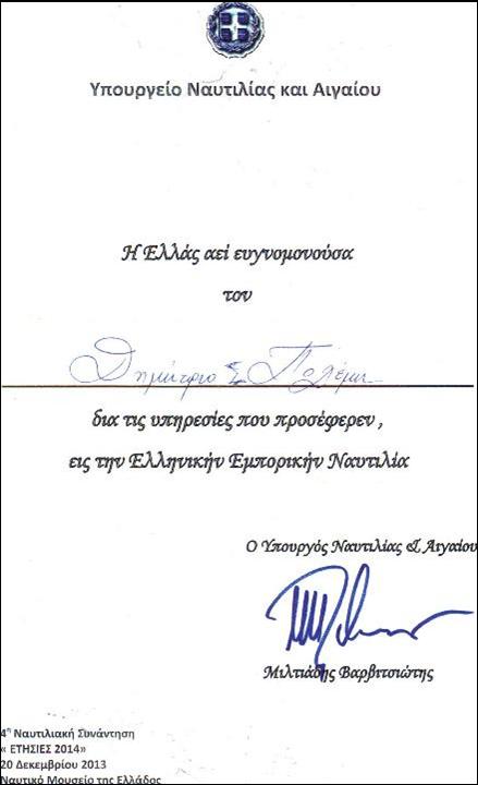 Αριστερά, εύφημος μνεία που απενεμήθη το 2013 στον Τάκη για την προσφορά του στην Ελληνική Εμπορική Ναυτιλία. |