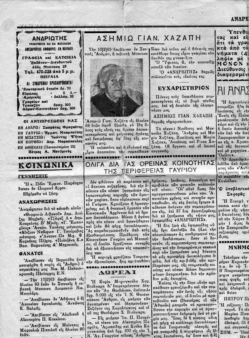 Πάνω, απόκομμα της εφημερίδας «ΑΝΔΡΙΩΤΗΣ» που αναφέρει τον θάνατο της Ασημιώς. Κάτω αριστερά (στους θανάτους) αναφέρονται και άλλοι δύο Στενιώτες. Ο Παλαιοκρασσάς Νικολός του Μιχαήλ (131541) #1703 info και η Μπαφαλούκου Διαμάντω του Αντωνίου (11131) #3914 σύζ. Μπεγλέρη Νικολάου του Λινάρδου.