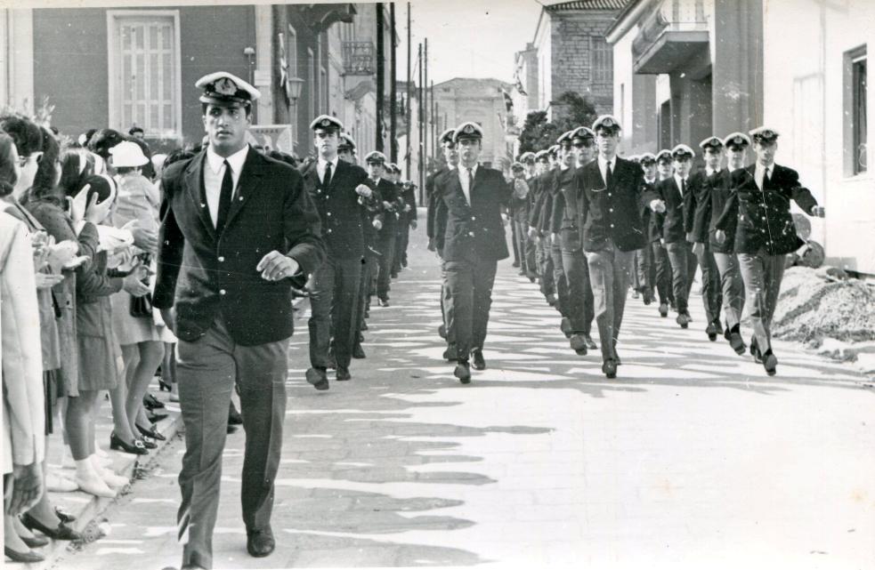 Επάνω, ο Δημήτρης ηγείται του Ναυτικού Λυκείου της Ανδρου, σε παρέλαση στη Χώρα.