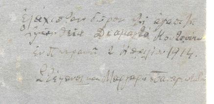 Η φωτογραφία προσφέρθηκε στην Διαμάντη Χαζάπη του Γιαννάκη σύζ. Κουτσούκου Χαριλάου του Βασιλείου. Η Διαμάντη ήταν θεία της Μαργαρώς Σιγάλα (αδελφή της μητέρας της Χαζάπη Φραέσκας του Γιαννάκη συζ. Σέλα ή Σιγάλα Ιωάννη του Γεωργίου.