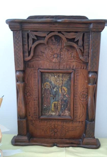 Αριστερά μια εικόνα του Ευαγγελισμού της Παναγίας που φιλοτέχνησε για την κόρη του Ευαγγελία. Η όμορφη ξύλινη σκαλιστή κορνίζα είναι και αυτή δικής του κατασκευής.