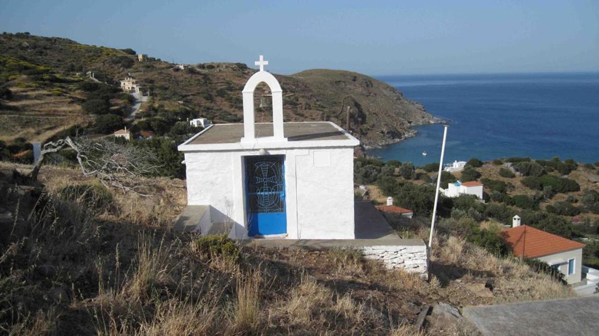Διακρίνεται δεξιά από τον ιστό, και το εξωκλήσι της Αγίας Φωτεινής πάνω από τα Πίσω Γιάλια.