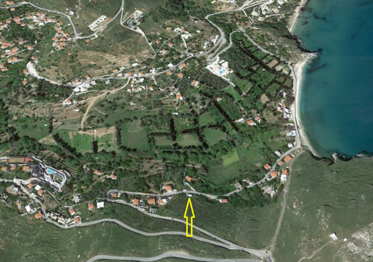 Κάτω, η θέση του εξωκλησιού των Εισοδίων σημειώνεται με το κίτρινο βέλος.