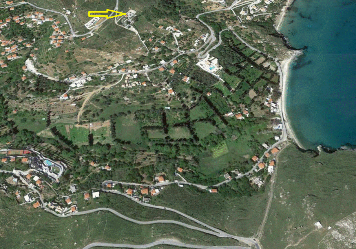 Κάτω, η θέση του εξωκλησιού του Αη Σάββα σημειώνεται με το κίτρινο βέλος.
