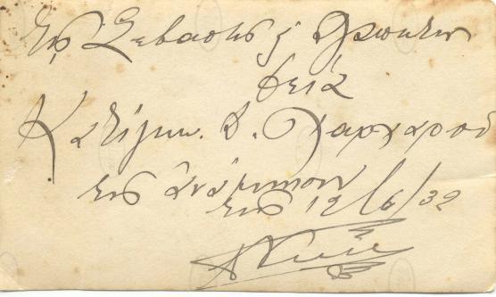 Πίσω από τη φωτογραφία, αφιέρωση του Ανδρέα Βεστάρχη στη θεία του Κατίγκω Δ.Χαρχαρού |