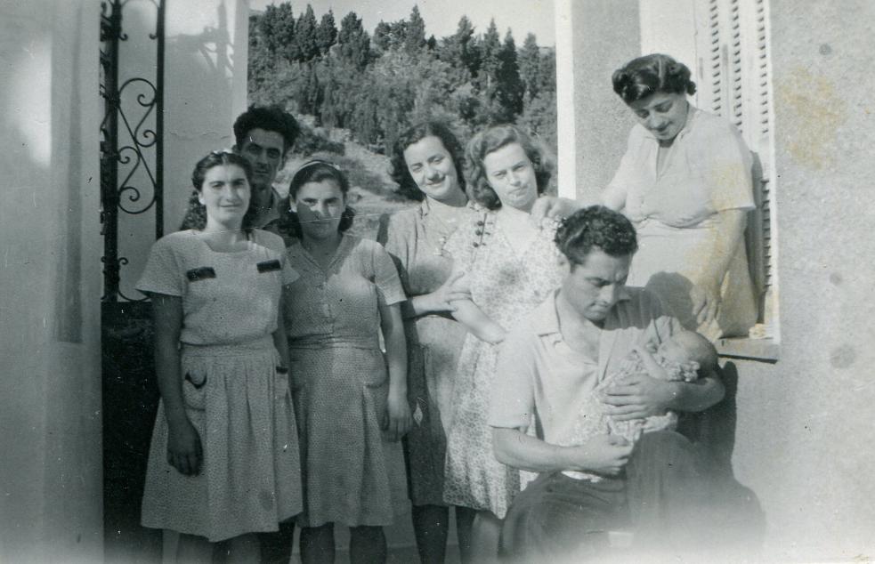 Φωτογραφία του 1947. Η γειτονιά έχει μαζευτεί και φωτογραφίζεται με τη νεογέννητη Γιολάντα. Η αυλή είναι απέναντι από το σπίτι της Γιολάντας. Από αριστερά:
