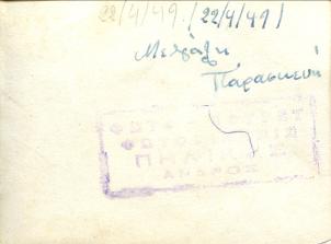 Στο πίσω μέρος της ίδιας φωτογραφίας που προσέφερε ο κος Χαρίλαος Νικ. Χαζάπης φαίνεται ότι αυτή τραβήχτηκε την 22α Απριλίου, Μεγάλη Παρασκευή του 1949. |