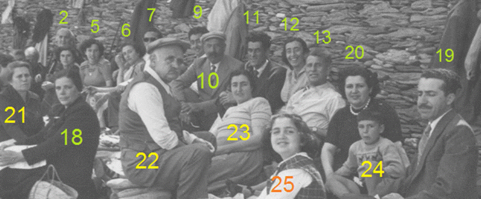 Αριστερά από την Μπεγλέρη Ανδριάνα του Χρήστου η 21. Μπόνη Ανδριάνα του Νικολάου (11511) #3451 σύζ. Φαλαγκά Νικολάου του Αντωνίου Δεξιά από την Μπεγλέρη Ανδριάνα του Χρήστου καθιστός σε στίβα από πέτρες με την τραγιάσκα ο 22. Πολέμης Δημήτριος του Αντωνίου (Πίκουλος) (141221) #1044 info. Μεταξύ Πίκουλου και Νικολή ο σύζυγος της Ανδριάνας Μπόνη, Φαλαγκάς Νικόλαος του Αντωνίου. Δεξιά από τον τον Νικολή και την Αδαμαντία είναι ο Σαρρής Σταμάτης του Αντωνίου και εμπρός από αυτόν η σύζυγος του 23. Χαζάπη Κατίνα του Κωνσταντίνου (12241) #208 info Δεξιά από τον Σταμάτη η Πολέμη Ευανθούλα του Δημητρίου και ο σύζυγος της Σιγάλας Σπύρος του Δημητρίου και τα παιδιά τους 24. Σιγάλας Δημήτριος του Σπύρου (14122111) - και 25. Σιγάλα Πόπη του Σπύρου (14122112) - info.