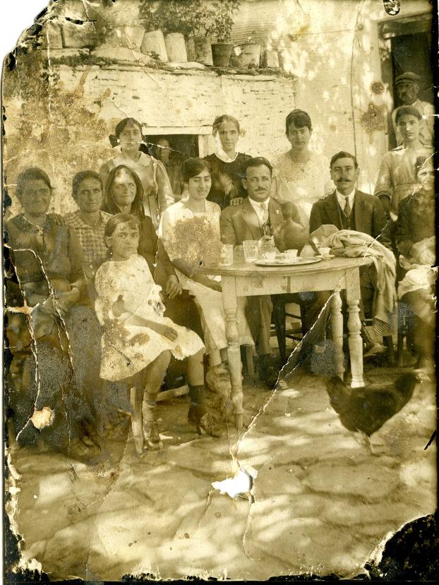 Καθιστοί από αριστερά προς τα δεξιά: Χαζάπη Κατίνα του Ιωάννη (1117) #1417 σύζυγος του Γιαλούρη Μιχαήλ του Λεωνίδα θεία του γαμπρού Χαζάπη Φλωρεντία του Ιωάννη (1116) #1416 σύζ. Μπαφαλούκου Περάκη του Αντωνίου θεία του γαμπρού. Η μητέρα του γαμπρού Χαζάπη Διαμάντη του Ιωάννη (1111) #1411 σύζ. Κουτσούκου Χαριλάου του Βασιλείου Η νύφη Παλαιοκρασσά Μόσχα του Ιωάννη (12241) #3616 Ο γαμπρός Κουτσούκος Ιωάννης του Χαριλάου (11112) #2785 Αγνωστος, και άγνωστη