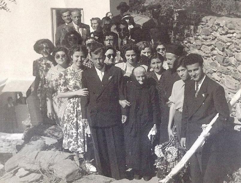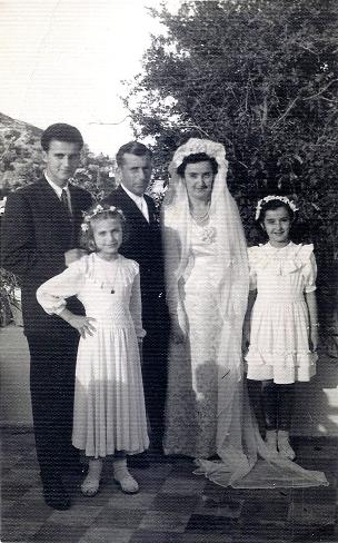 Ο γάμος έγινε το 1950. Αριστερά το σόι του γαμπρού (από το Μεσαθούρι) καθ’οδόν προς το σπίτι της νύφης στην Πέρα Μπάντα. Τον γαμπρό κρατάει η μητέρα του Μαριγώ. Στα δεξιά της φωτογραφίας ο κουμπάρος Γιώργος Κολυδάς (και αυτός από το Μεσαθούρι) που κρατάει τις λαμπάδες.