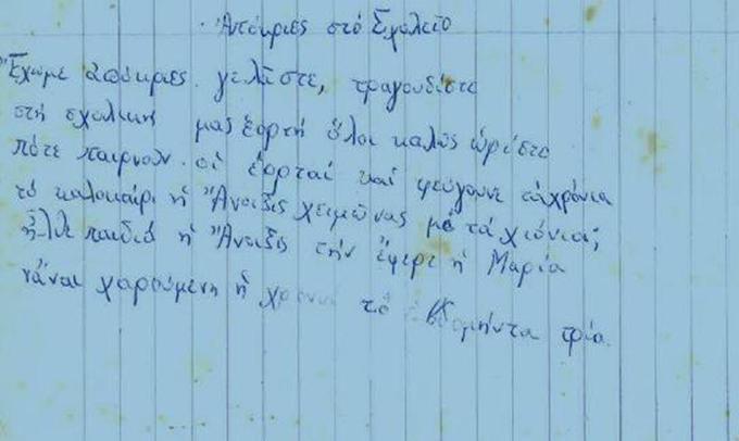 Εχουμε Απόκριες, γελάστε, τραγουδήστε! Στη σχολική μας εορτή όλοι καλώς ορίστε! Πότε περνούν οι εορτές και φεύγουνε τα χρόνια Το καλοκαίρι, η άνοιξη, χειμώνας με τα χιόνια Ηλθε παιδιά η άνοιξη, την έφερε η Μαρία Να ‘ναι χαρούμενη η χρονιά, το εβδομηντατρία.