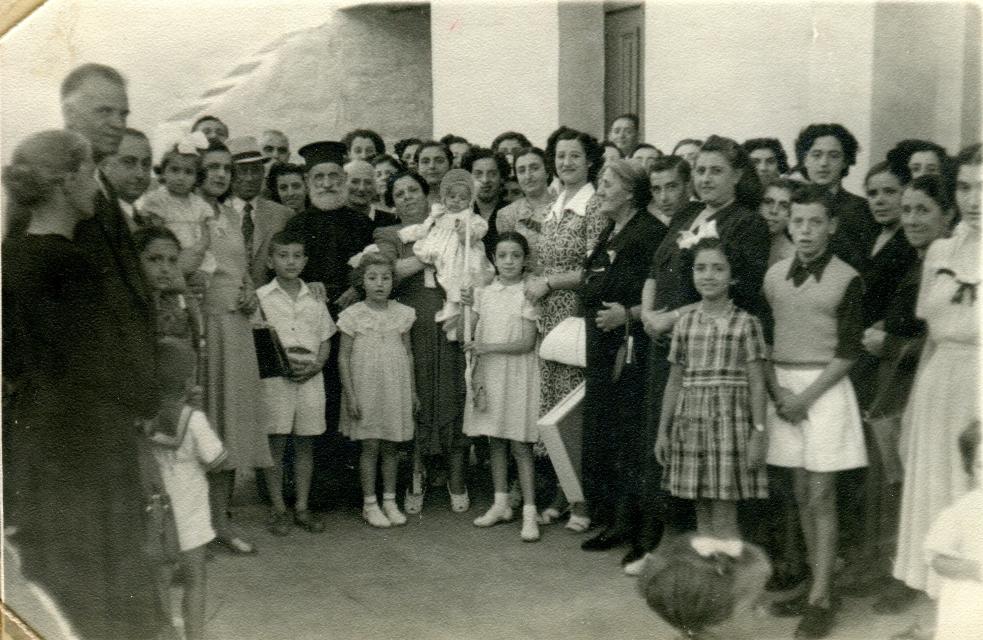 Διακρίνονται από αριστερά οι Λογοθέτης Γεώργιος του Επαμεινώνδα (Γασπαρής) (1234) #2313 info και δίπλα του αυτός που κοιτάζει το φακό της φωτογραφικής μηχανής είναι ο Χαζάπης Δημήτριος του Νικολάου (11322) #331 info και ακριβώς δίπλα του η σύζυγος του Σύμπουρα Ανδριάνα του Δημητρίου (1512) #194 info που κρατάει στην αγκαλιά της την κόρη τους Χαζάπη Μαργαρούλα του Δημητρίου (113221) #198 info Λίγο δεξιότερα από την Ανδριάνα φαίνεται ο Παπανίκος Βασιλόπουλος (1) #2401 info, αριστερά από το καλυμμαύχι του οποίου διακρίνεται ο Βαλμάς Νικόλαος του Ανδρέα (11142) -. Δεξιά από το καλυμμαύχι του Παπανίκου φαίνεται η Στεφάνου Αλίκη του Ανδρέα (1243) #1539 info σύζυγος του Πασχάλη Γεώργιου του Ιωάννου. Δεξιά (στέκεται πίσω) από τον Παπανίκο φαίνεται η μία από τις γιαγιάδες του Σωκράτη, η Κυρτάτα Μαριγούλα του Ανδρέα (141161) #2240 info σύζυγος Κουτσούκου Αντωνίου του Δημητρίου. Δεξιά της Μαριγούλας με τον νεοφώτιστο Πασχάλη Σωκράτη του Δημητρίου (1112111) #151 info η νονά του Σαρρή Πετρωνία του Αντωνίου (13124) #726 σύζυγος του Κυρτάτα Λεωνίδα του Ανδρέα. Τα δύο κοριτσάκια μπροστά από την Πετρωνία είναι η Σαρρή Ρένα του Σταμάτη (131262) #211 info (αριστερά) σύζυγος Στρούβαλη Κώστα και η Σαρρή Λασκαρίτσα του Σταμάτη (131261) #210 info σύζυγος Ντατσούλη Αγγέλου (δεξιά με τη λαμπάδα). Στο αριστερό μέρο της φωτογραφίας, μπροστά από τον Γιώργη Λογοθέτη, διακρίνεται η μικρή Μανδαράκα Μαρίκα του Νικολάου (12221) #1514 info, που κοιτάζει τον φακό.