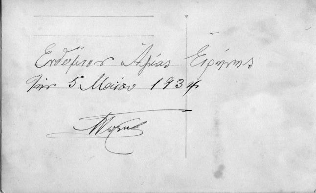 Στο πίσω μέρος της φωτογραφίας, τα καλλιγραφικά γράμματα και η υπογραφή είναι του Γιώργη Μπέη.