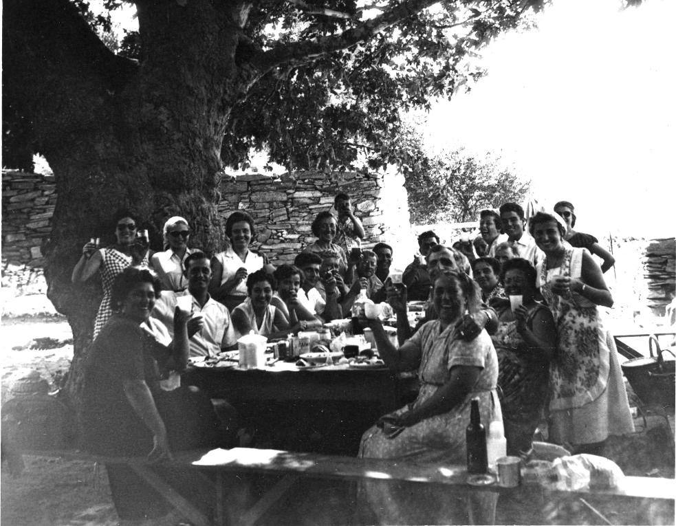 Στενιώτικη συντροφιά στο προαύλιο του μοναστηριού κάτω από τον μεγάλο πλάτανο. Από αριστερά: Καθιστοί: