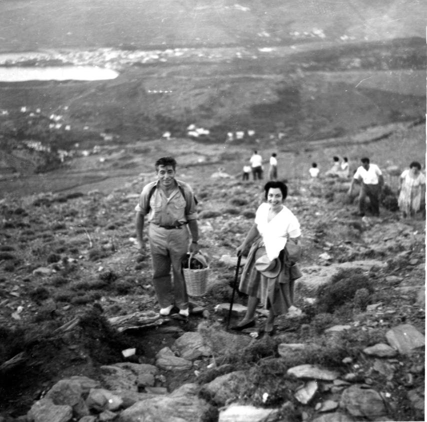 Πάνω, Στενιώτικη παρέα, χαράματα, ανεβαίνει στο μονοπάτι από τις Στενιές προς το μοναστήρι του Αγίου Νικολάου.