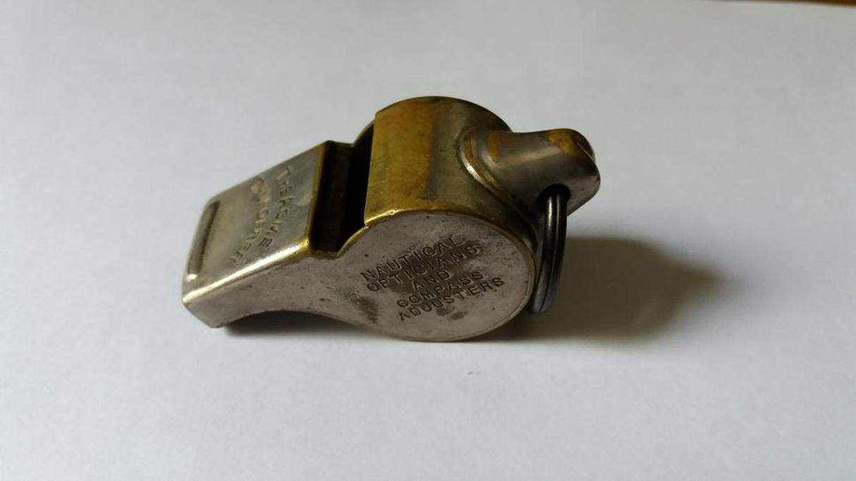 Στη φωτογραφία η σφυρίχτρα του Εξαδάκτυλου Γρηγορίου του Νικολάου (127) #490. Ορειχάλκινη επιχρωμιωμένη και με «στραγάλι» από φελλό, παρήγε ένα δαιμονισμένο θόρυβο.