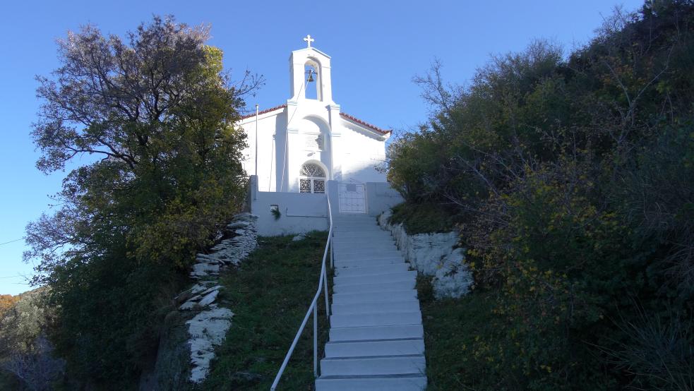 Πάνω, το περιποιημένο εξωκλήσι του Αη Γιάννη στο δρόμο από τη Στρατολάτισσα στα Γιάλια. Κάτω η επιγραφή πάνω από τη θύρα του εξωκλησιού. |