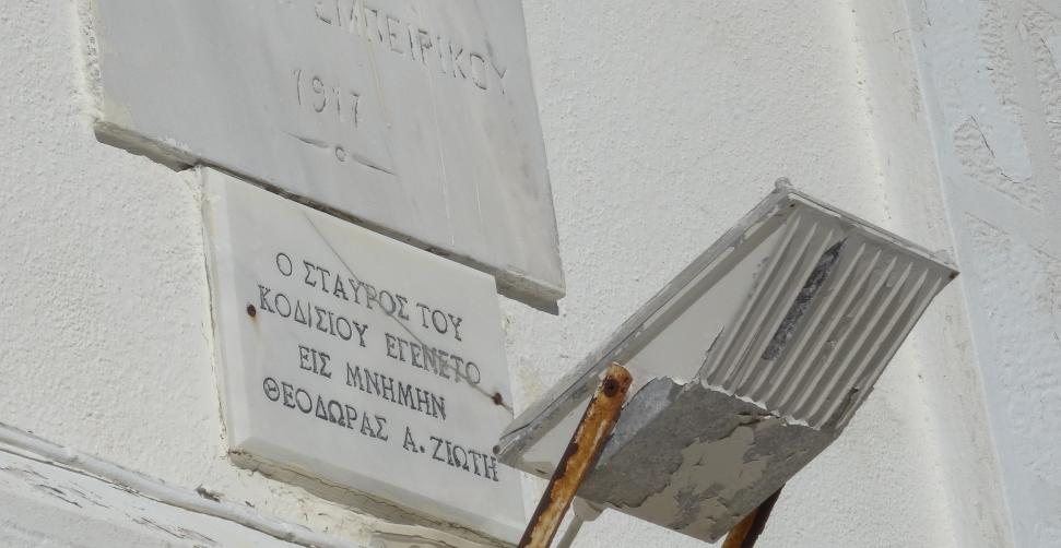 Επιγραφή για το σταυρό του Κωδωνοστασίου του Αη Γιώργη εις μνήμην Θεοδώρας Α. Ζιώτη