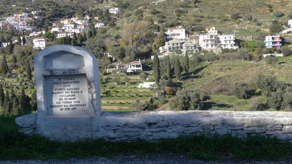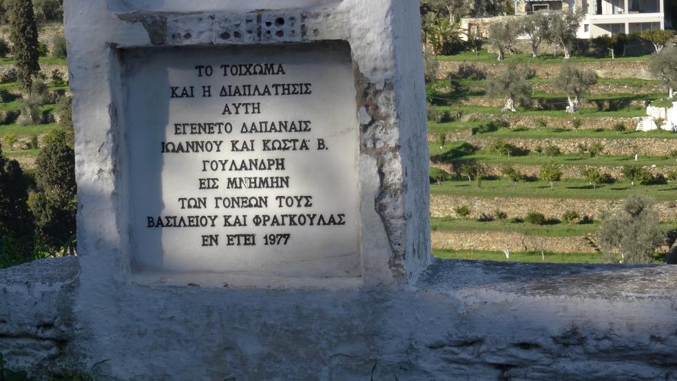 Η επιγραφή αναφέρεται στους Γιάννη και Κώστα Γουλανδρή και στους γονείς τους Βασίλη και Φραγκούλα Γουλανδρή. Ο Βασίλης Γουλανδρής΄(1886-1976) ήταν εφοπλιστής και διετέλεσε και βουλευτής Κυκλάδων το 1936. Ο Γιάννης (Big John) Γουλανδρής (1930-2016) ήταν και αυτός εφοπλιστής και υπήρξε εμπνευστής της διοργάνωσης των ιστιοπλοϊκών αγώνων Άνδρου, της οποίας είχε ανακηρυχθεί επίτιμος πρόεδρος. Όπως φαίνεται το έργο έγινε αμέσως μετά τον θάνατο του Βασίλη Γουλανδρή. |