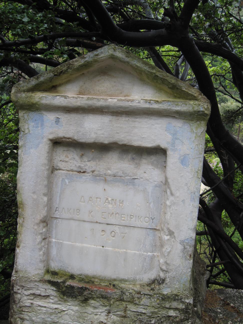 Η επιγραφή αναφέρεται στον Αλκιβιάδη Κ. Εμπειρίκο ο οποίος το 1907 χρηματοδότησε την κατασκευή του δρόμου πάνω στα ίχνη του παλιού μονοπατιού. Τα πέτρινα σκαλοπάτια αποτελούνταν από στρογγυλεμένες πλατιές πέτρες (πλάκες) του παρακείμενου ποταμού (κροκάλες). Αργότερα (1952) ο δρόμος τσιμεντοστρώθηκε. Για να δείτε τη σχετική μαρμάρινη πλάκα του 1952 πατήστε εδώ. Για να δείτε φωτογραφίες των εργασιών του 1952, πατήστε εδώ.