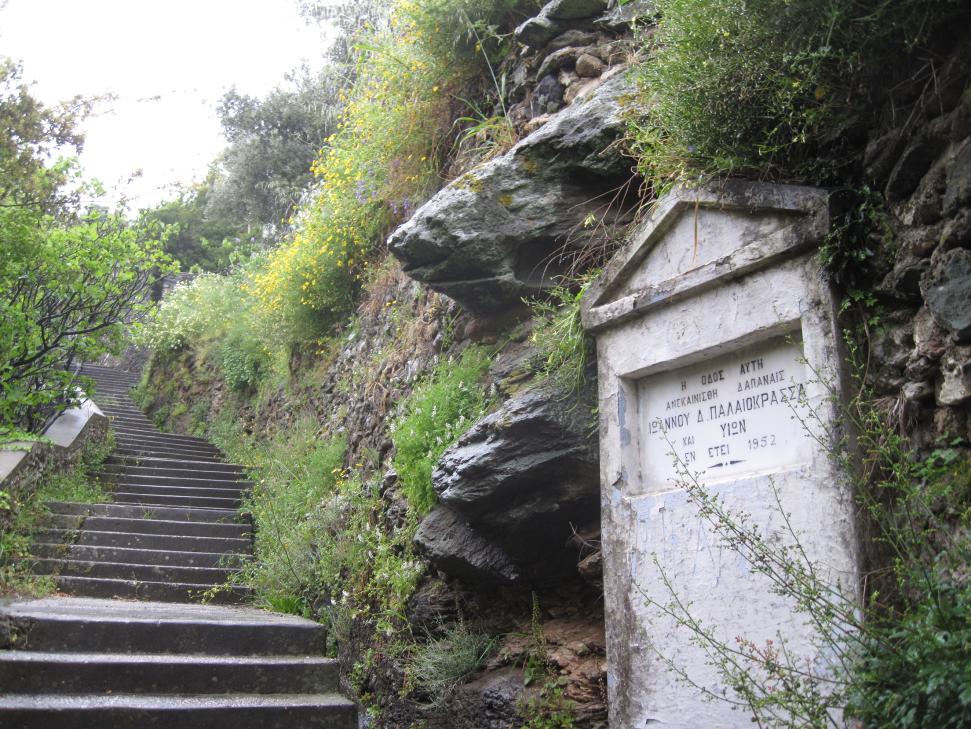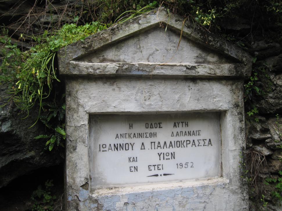 Η επιγραφή αναφέρεται στους Ιωάννη Δ. Παλαιοκρασσά (Παλαιοκρασσά Ιωάννη του Δημητρίου (1136) #395 info) και τους γιούς του, οι οποίοι το 1952 χρηματοδότησαν την τσιμεντόστρωση του δρόμου στη θέση του παλιού που ήταν στρωμένος από το 1907 με κροκάλες (πλατιές στρογγυλές πέτρες από την κοίτη του παρακείμενου ποταμού). _________________________________________________________________________