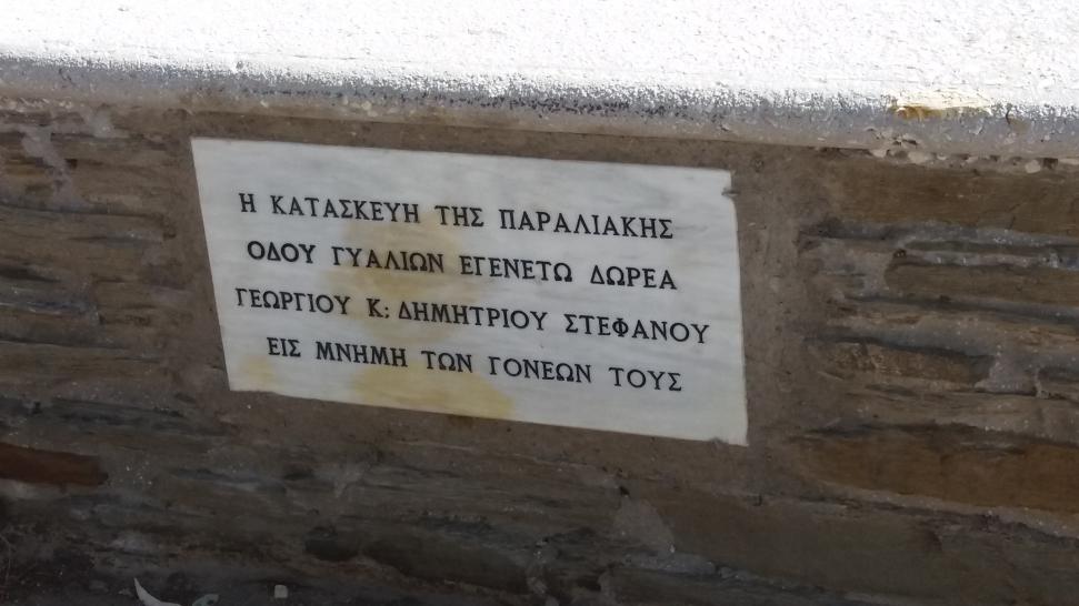 Η επιγραφή επισημαίνει τη δωρεά των Στεφάνου Γιώργη του Πέτρου (1122) #98 και Στεφάνου Δημήτρη του Πέτρου (1121) #97 info. Ο παραλιακός δρόμος στα Γιάλια είχε υποστεί τεράστιες καταστροφές μετά από μια θεομηνία που έπληξε τον παραλιακό δρόμο που συνδέει τις Στενιές με το υπόλοιπο οδικό δίκτυο του νησιού. Μπορείτε να διαβάσετε για το γεγονός πατώντας εδώ.