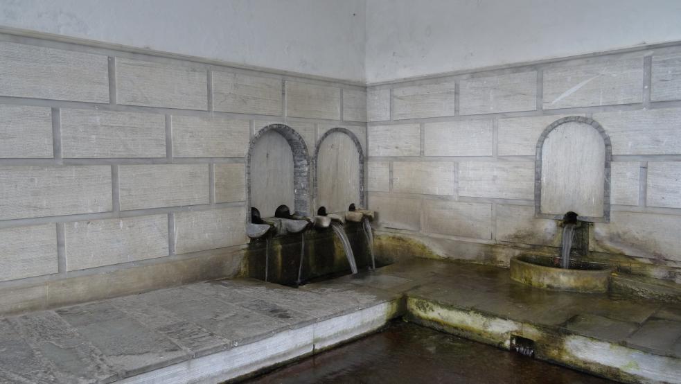 Η Πεντάβρυση όπως είναι σήμερα. Οι τέσσερις βρύσες είναι στο βάθος αριστερά, ενώ η πέμπτη στην κεφαλή της πλύστρας.