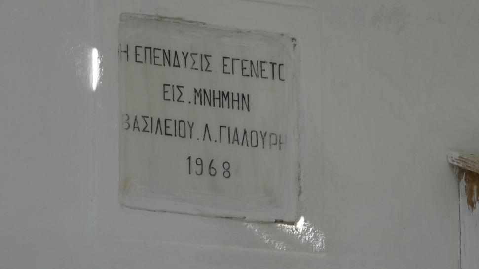 Η επιγραφή στο πάνω αριστερό μέρος του υπόστεγου, αναφέρεται στον Βασίλη Λ.Γιαλούρη (Γιαλούρης Βασίλης του Λεωνίδα (1234) #3010 info).