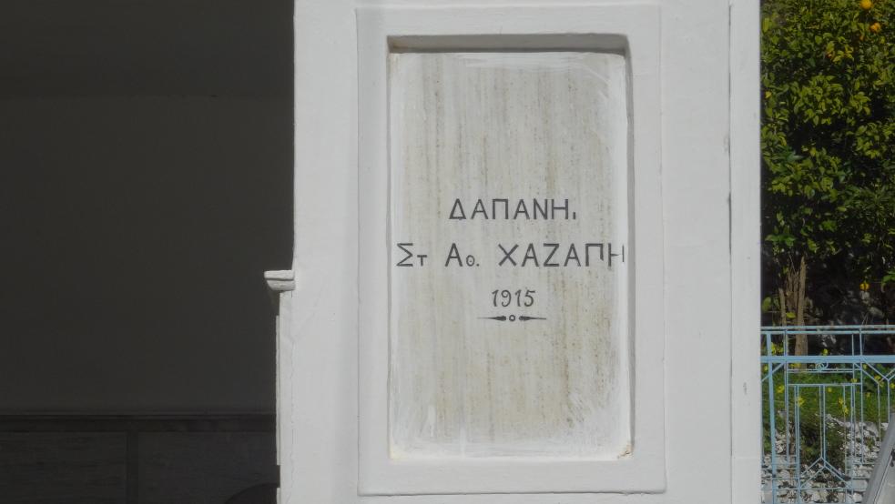 Η λιτή και σωστά γραμμένη επιγραφή αναφέρεται στον Στ. Αθ. Χαζάπη (Χαζάπης Σταμάτης του Αθανασίου (124) #1867 info) που το 1915 χρηματοδότησε το έργο.