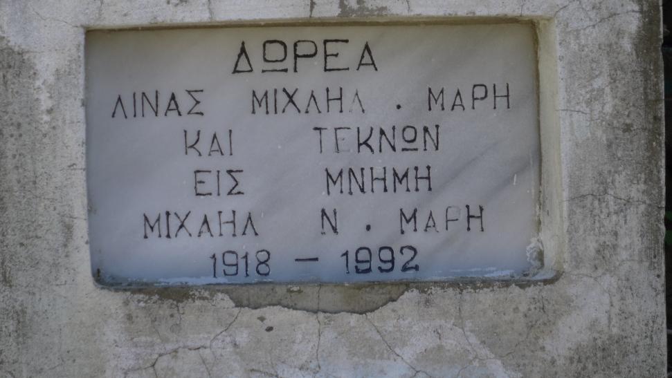 Στην επιγραφή αναφέρονται τα ονόματα της Λίνας Μιχαήλ Μαρή (Δελαγραμμάτικα Λίνα του Γεωργίου (11331)) και του Μιχαήλ Ν. Μαρή (Μαρής Μιχαήλ του Νικολάου (11331)). |