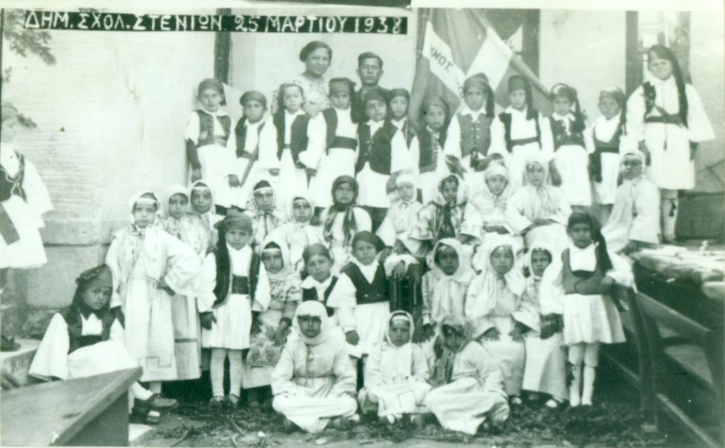 Στην παραπάνω φωτογραφία οι μαθητές και οι μαθήτριες είναι ντυμένοι με εθνικές στολές για τη Γιορτή της 25ης Μαρτίου, το έτος 1938. Στο πίσω και κεντρικό μέρος της φωτογραφίας διακρίνονται η δασκάλα Πολέμη Μανιώ του Λεωνίδα (1122241) #910 info και ο σύζυγος της δάσκαλος Σάλαρης Γεώργιος του Κωνσταντίνου (1122241) #913 info .